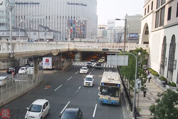 阪急バス13系統は、梅田バス停を発車してすぐ阪急百貨店横を通る(2016年10月、宮武和多哉撮影)。