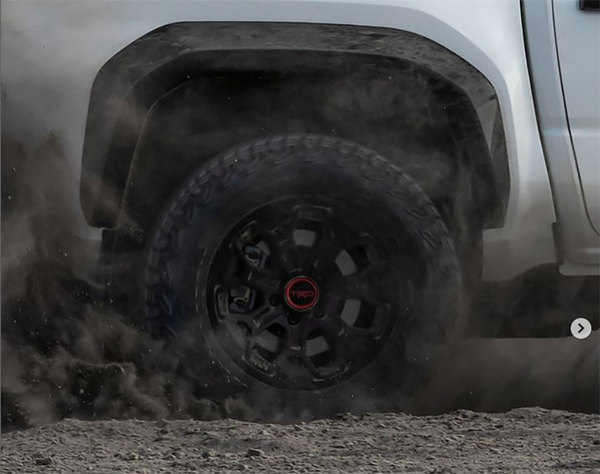 「オフロード性能とオンロード性能が融合。 まったく新しい2024年のトヨタ #Tacoma が間もなく登場します」というコメント共に投稿された写真、このリアタイヤのホイールに、アメリカのクルマメディアが注目しています。ホイールの奥にディスクブレーキが見えるからです。