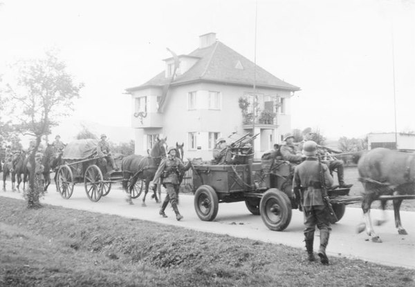 行軍するドイツ軍、中央に「対空馬車」(画像:Bundesarchiv、Bild 146-2005-0176/CC-BY-SA 3.0、CC BY-SA 3.0 DE〈https://bit.ly/3DYz6ld〉、via Wikimedia Commons)。