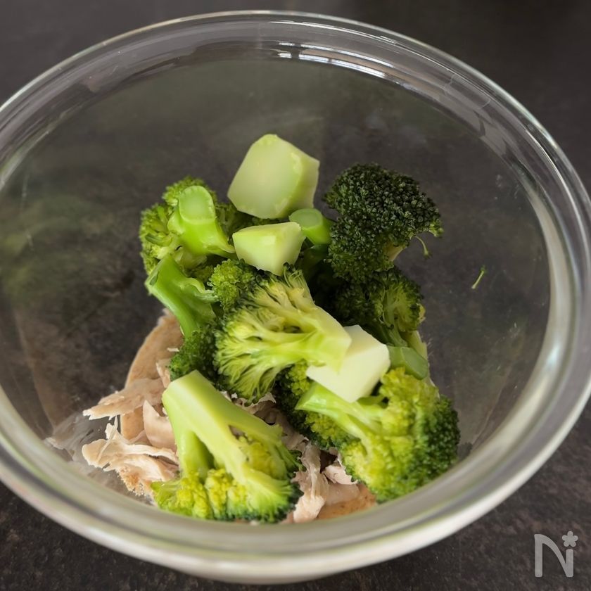 (3) 蒸しあがったささみはひと口サイズにほぐし、ブロッコリーと一緒にドレッシングと和える。