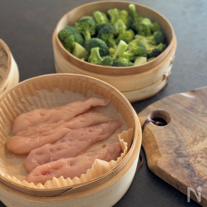 (1) ささみはフォークで穴を開け、酒と塩をふる。蒸篭に入れ、ささみは10分、ブロッコリーは5分蒸す。