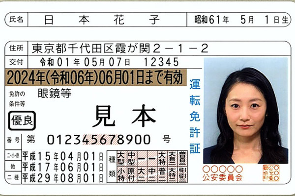 免許証の見本で有名な日本花子さんは5、6ケタ目が「45」なので、噂通りなら学科に落ちてしまっている(画像:警察庁)。