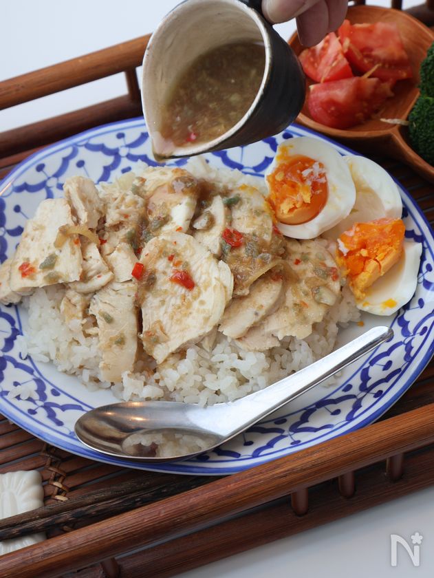 (5) 器に米を盛り、鶏肉をひろげのせ、[3]のタレをたっぷりかける。