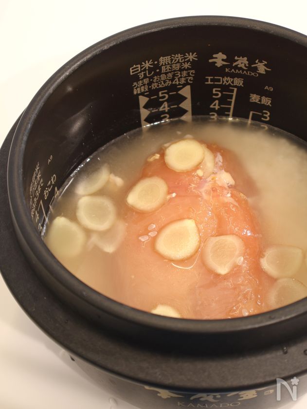 (2) 炊飯器に米と中華スープを加えぐるりと混ぜ、干しえびを広げ入れ、鶏むね肉をのせる(下味のも一緒に)、上に生姜をひろげのせ、早抱きモードで炊く。炊き上がったら10分蒸らす。