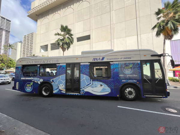 ANA(全日空)が2022年7月から、ハワイ・ホノルルのワイキキ~アラモアナを結ぶANA電気バス「ANA エクスプレスバス」の運行を再開しています。これは、同社が保有する超大型旅客機、エアバスA380「フライングホヌ(FLYING HONU。“空飛ぶウミガメ”を意味する)」のホノルル線定期便運航再開にあわせたものです。