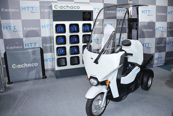ガチャコのバッテリー交換ステーションとホンダ「ジャイロキャノピーe:」(乗りものニュース編集部撮影)。