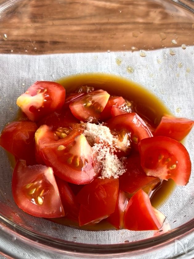 (2) ボウルにトマトと【A】を入れて混ぜ、味をなじませる。