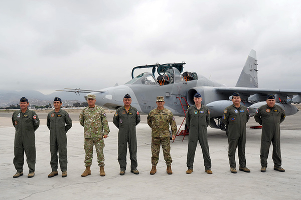 ペルー空軍のSu-25を背景に撮影する各国空軍代表者(画像:アメリカ空軍)。