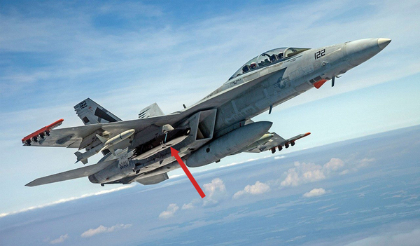 AGM-158C LRASM(矢印部分)を搭載するF/A-18E/F「スーパーホーネット」(画像:ロッキード・マーチン)。