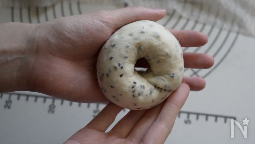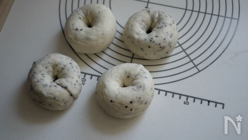 予熱が完了したら、水1L、砂糖大さじ1(分量外)をフライパンに入れ沸騰させる。沸騰後、弱火にし泡が落ち着いてからベーグルをそっと入れる。片面30秒ずつ茹でる。