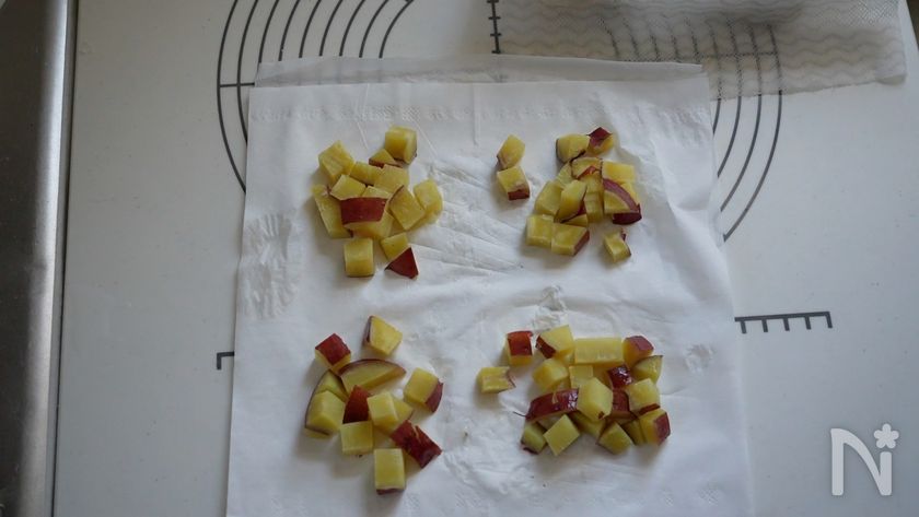 (下準備) ・さつまいもの甘露煮はサイコロ状にカットし、4等分にしておく。