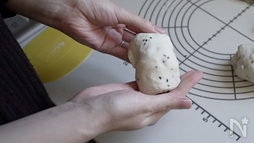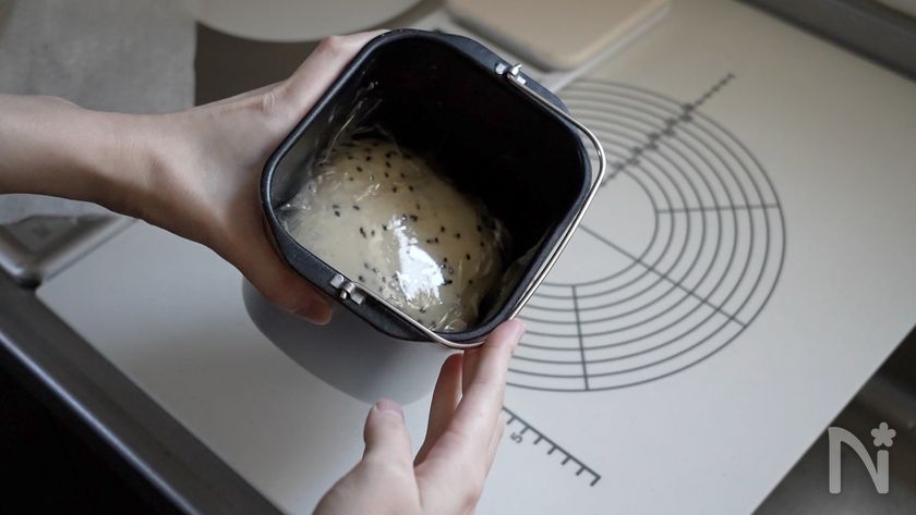 ホームベーカリーの容器に【A】を入れ、15分こねる。生地がまとまったら黒ごまを加え、5分こねる。