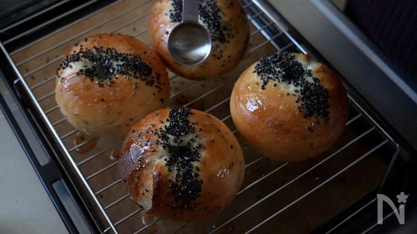 茹でたらすぐにオーブンシートを敷いた鉄板に乗せ、黒ごまを飾りオーブンに入れる。220度に予熱したオーブンで14分焼く。(焼き始めて6分後に鉄板の向きを変え、焼きムラを防止する)