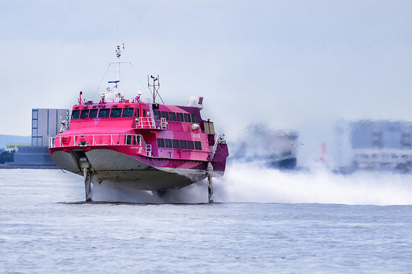 「ジェットフォイル」は全没翼型水中翼旅客船といい、その名の通り全没型の水中翼に働く翼揚力を利用して、船体を完全に海面上へ持ち上げて高速で航走する船です。ジェット機は、高温ガスを噴出させて推力を得ているのに対し、ジェットフォイルは海水を高圧噴射することで高速力を発揮します。