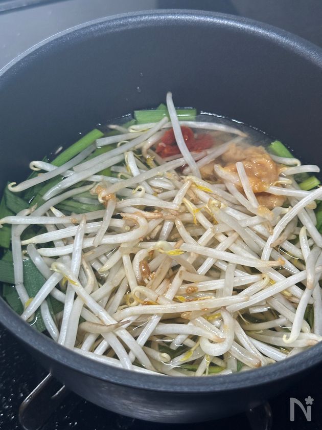 (1) 鍋に3〜4cm幅に切ったニラともやし、水、【A】を入れて中火で加熱する。