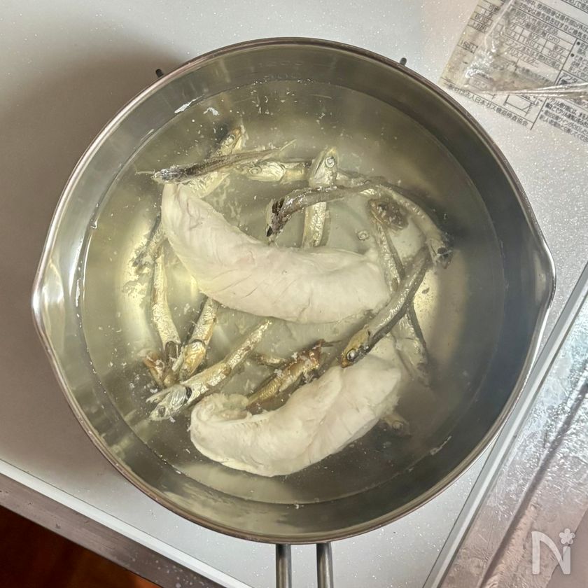 煮立ったらアクを除いてごく弱火にし、5分ほどゆでてささ身に火を通し、引き上げる。