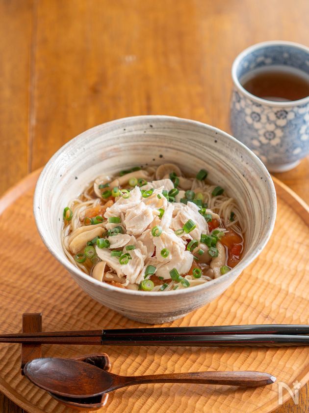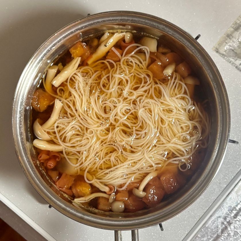 (8) ⑤のつゆにそうめんを加え、ひと煮して温め、塩で味をととのえる。