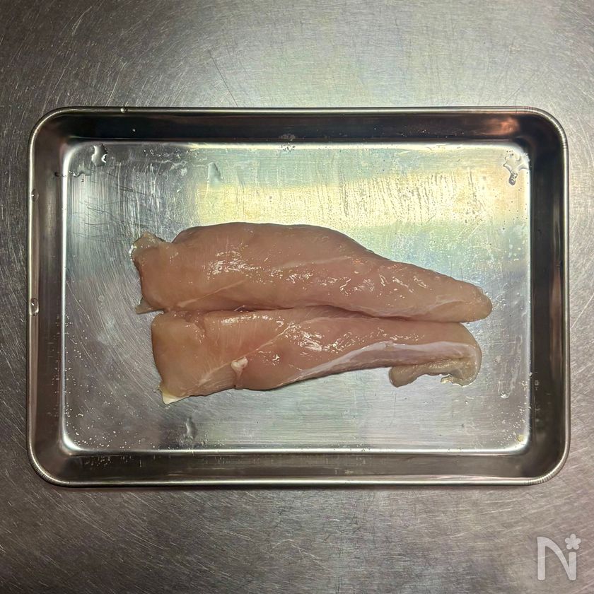 (2) 鶏ささ身は【B】をすり込んで室温に10分ほどおく。