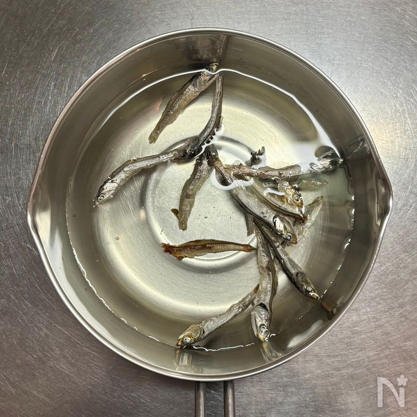 ざるに上げ、流水でもみ洗いして表面のぬめりを落とし、水気をしっかりと押し絞る。