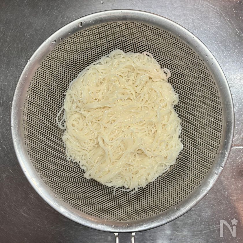 (7) 別の鍋にたっぷりの湯を沸かし、そうめんを袋の表示時間通りにゆでる。