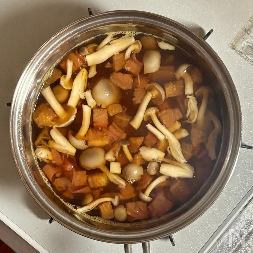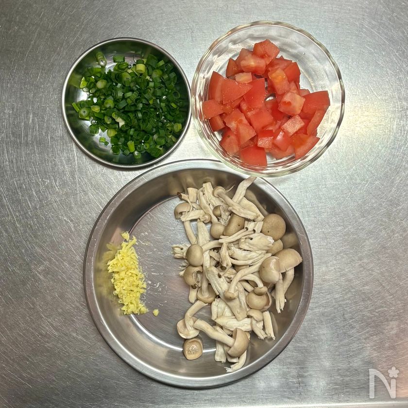 (5) ④のゆで汁に【C】を加え、しょうが、しめじ、トマトを加えて弱めの中火で2分ほど煮る。