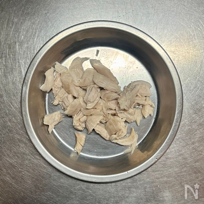(6) ④のささ身は粗熱がとれたら筋を除いて細かく裂く。