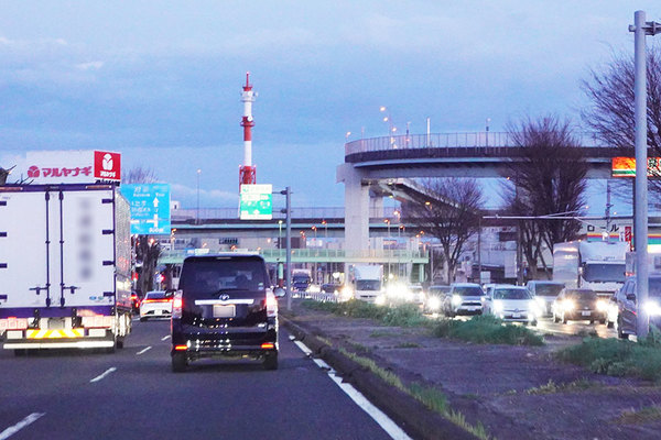 首都高の終点になる「上尾南」出入口付近では、amazonの倉庫をはじめ巨大な物流施設がひしめき、交通量が一気に増加。道路にはかなり余裕があるものの、主要な県道と交わる箇所が連続するため、上尾市内でも渋滞が見られます。