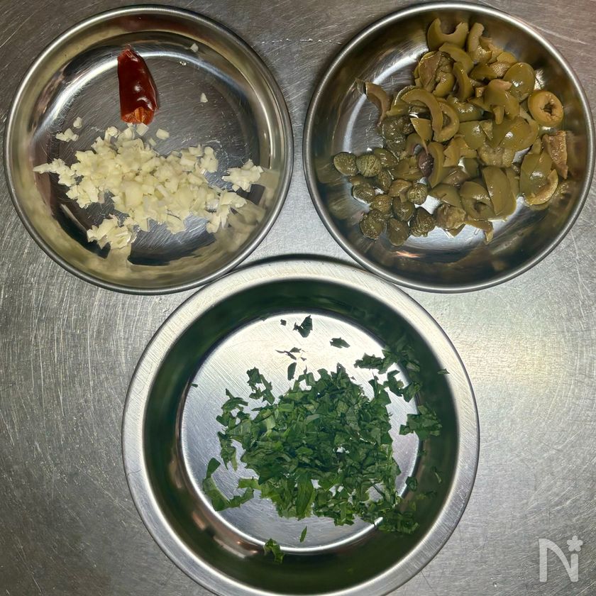 グリーンオリーブは粗みじん切りにし、ケイパーと合わせておく。