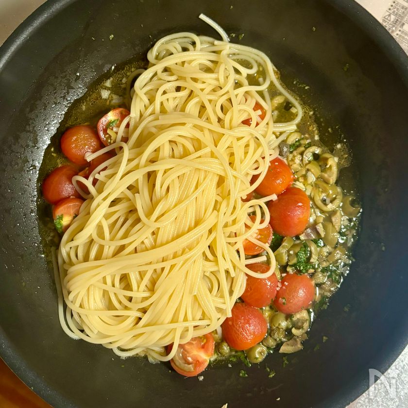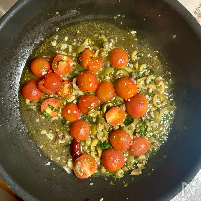 (5) 3のフライパンに2のグリーンオリーブとケイパーを加え、中火で30秒ほど炒める