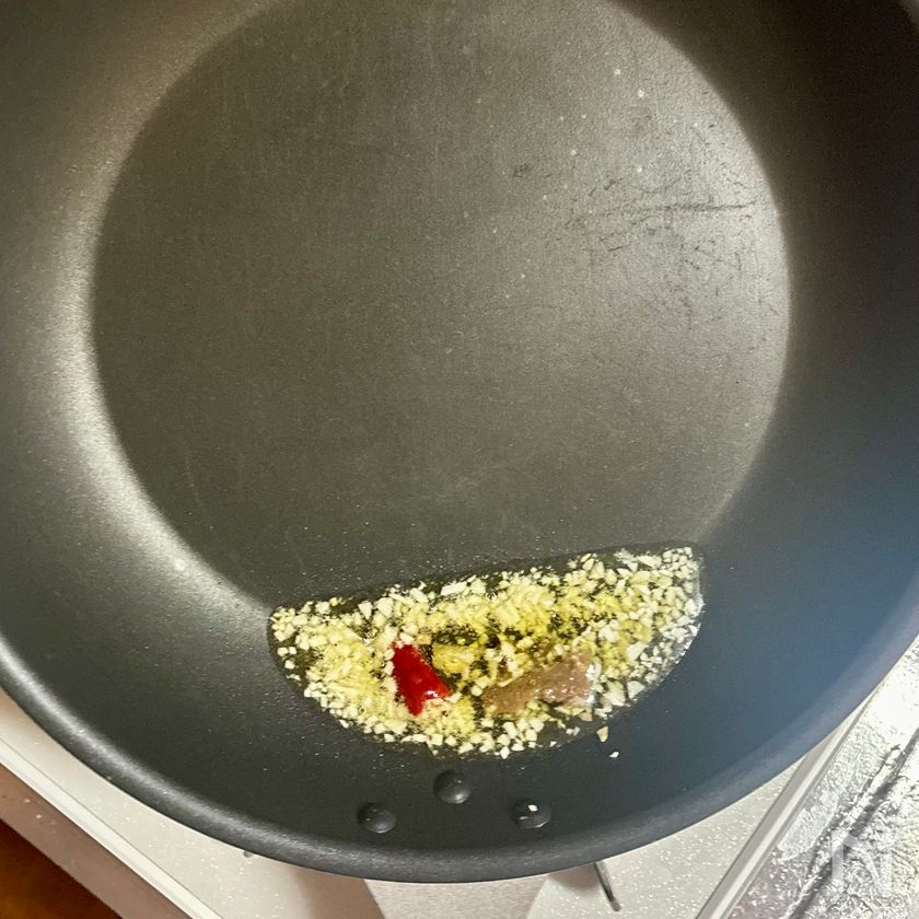 工程3では、にんにくと赤唐辛子を弱火でじっくりと加熱し、香りを油に移します。