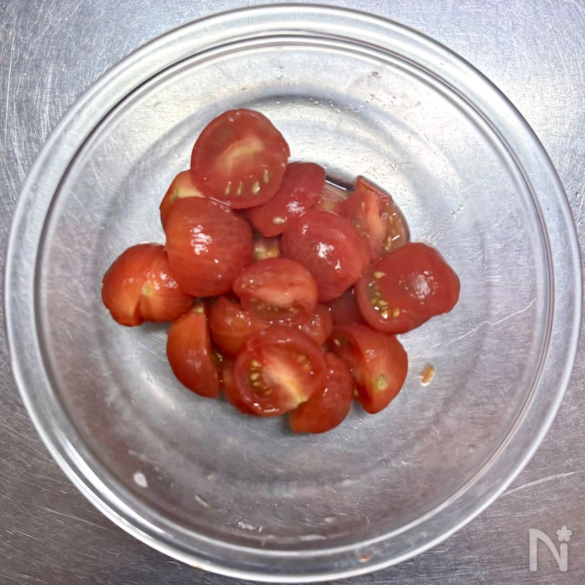 (1) ミニトマトは次の通り皮をむき、横半分に切る。