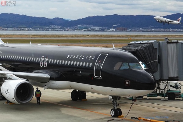 空港に駐機場でひと際目立つ、真っ黒な胴体が特徴のスターフライヤーは、北九州空港を拠点に国内6都市へ就航するほか、北九州や中部と台北を結ぶ国際線なども開設している航空会社です。同社の飛行機(羽田発関西行き)に搭乗しました。