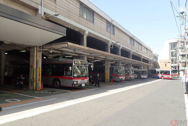 綱島駅の東口を出れば、商店街の向こうに複数台のクレーン車が見え、新綱島駅の位置は前知識がなくとも容易に把握できます。さっそくそちらへ歩みを進めていくわけですが、綱島駅北口高架下のバスターミナルへと向かうと、ひっきりなしに出入りする路線バスに行く手を阻まれます。バス路線を眺めれば、新横浜駅行きの系統が日中1時間に1、2本運行され、所要時間はおよそ20分。ちなみに現行の鉄道路線で向かうならば、菊名駅(横浜市港北区)でのJR横浜線乗り換えを挟んで10~15分前後。これが新綱島駅開業により大幅に短縮されます。