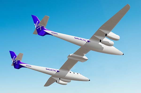 新型マザーシップは高度5万フィート(1万5240m)で宇宙船を運び、そこで切り離しを行う役割を担います。イメージ画像では、エンジンは左右各2発を搭載する「4発機」で、双胴機のレイアウトとなっており、2本の胴体の間に宇宙船を搭載すると見られます。