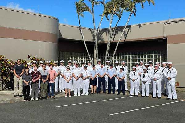 JTWCの建物前に整列したスタッフ。白い制服を着ているのがアメリカ海軍所属で、中央のブルーの制服を着ているのがアメリカ空軍所属。そして向かって左側の私服姿が民間人。まさに合同組織といった趣である(画像:JTWC)。