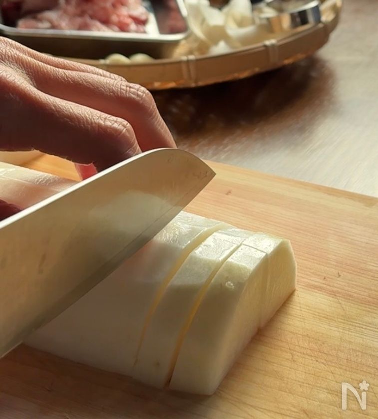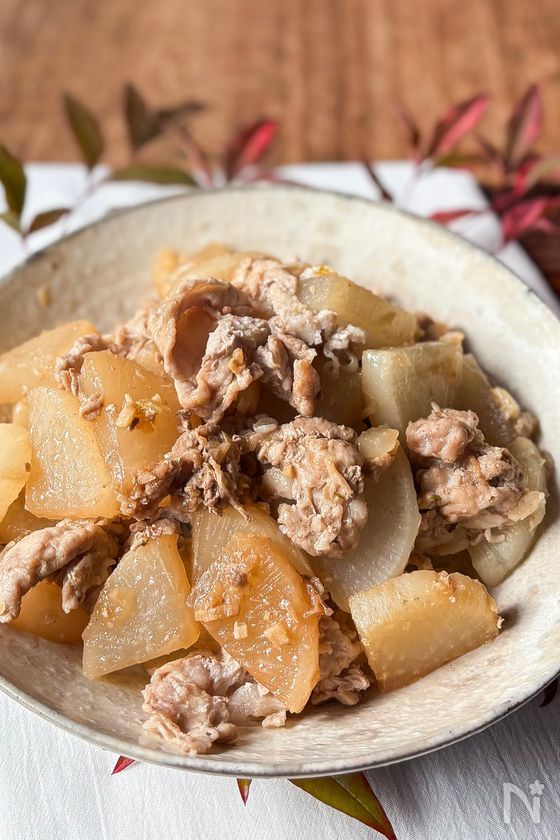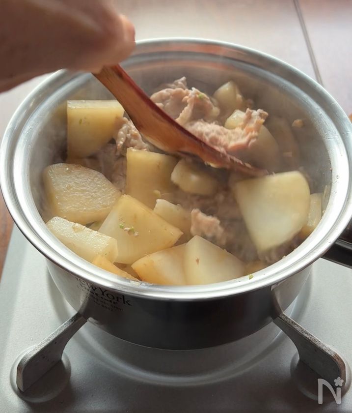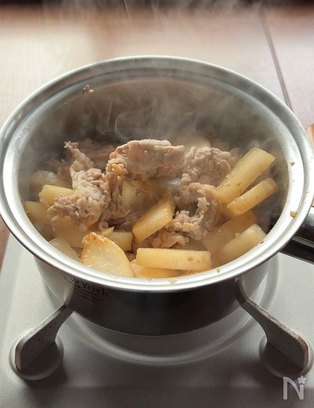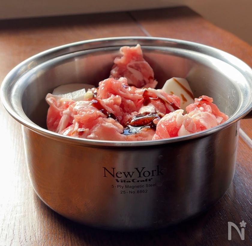 (2) 鍋に大根・にんにくを入れ、その上に豚小間肉、【A】を加える。