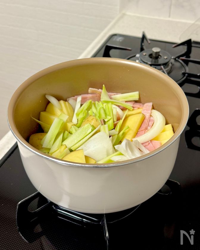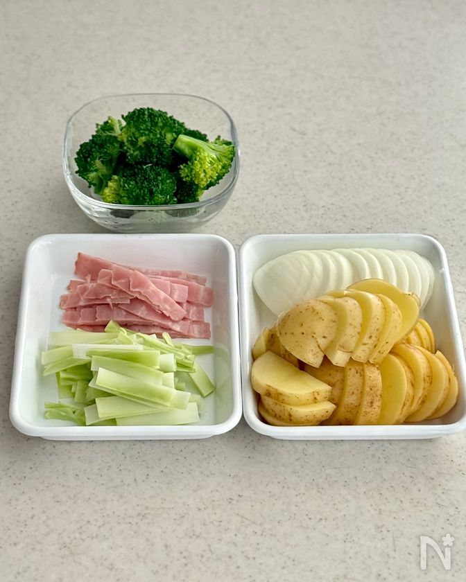 新じゃがいもは5mm幅のいちょう切りにする。玉ねぎは薄切りにし、ベーコンは5mm幅に切る。
