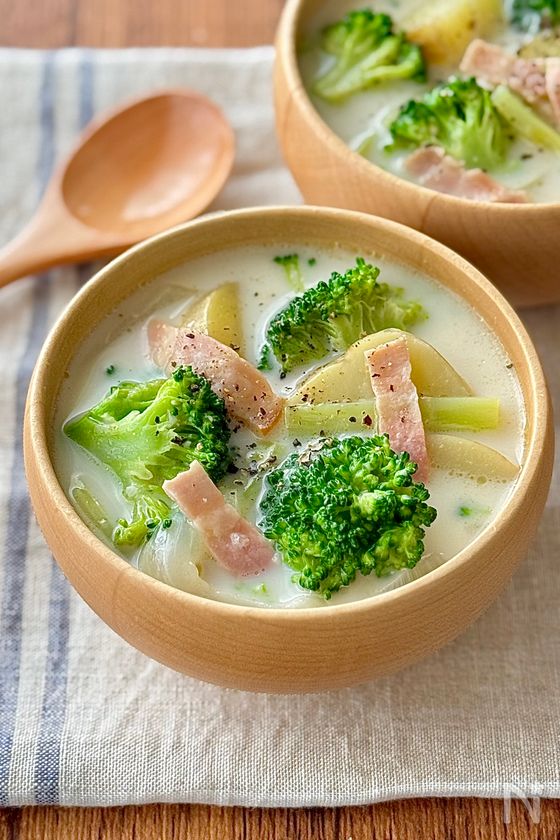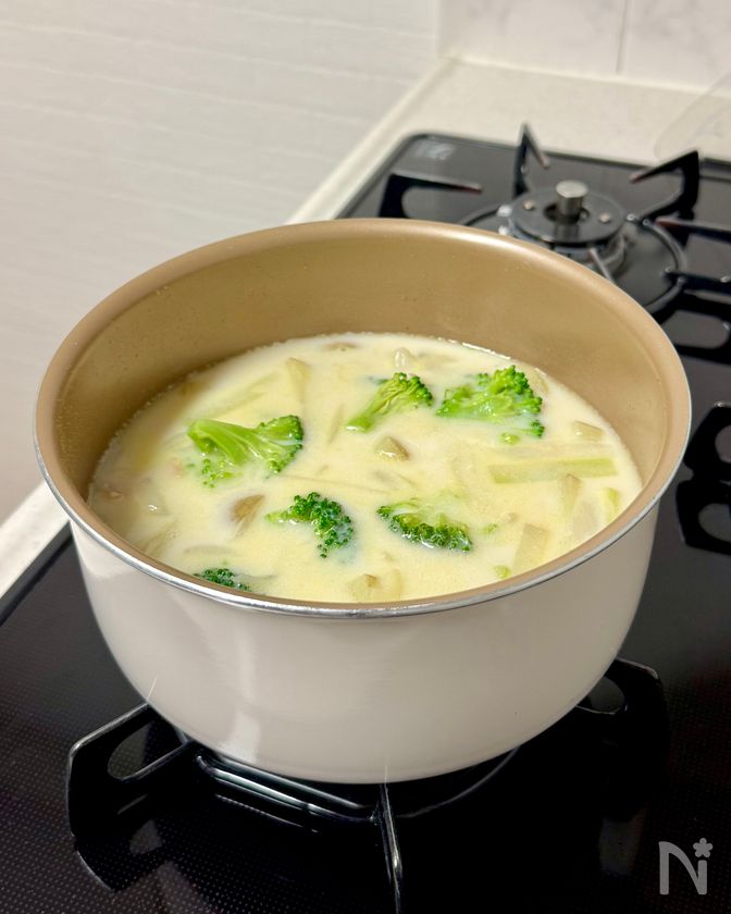 (4) じゃがいもがやわらかくなったら牛乳を加える。火を弱め、味噌を溶き入れ、ブロッコリーを加えて沸騰させないよう温める。器に盛り、お好みで粗挽き黒胡椒をふる。