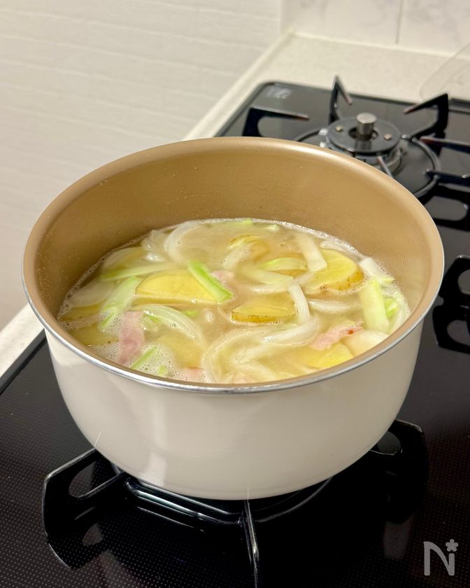 (2) 鍋にバターを入れて中火にかけ、じゃがいも・玉ねぎ・ベーコン・ブロッコリーの芯を炒める。