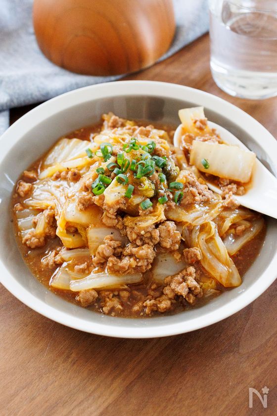 (3) ひき肉と白菜をよく混ぜ合わせ、再度蓋をして中火で5分加熱する。