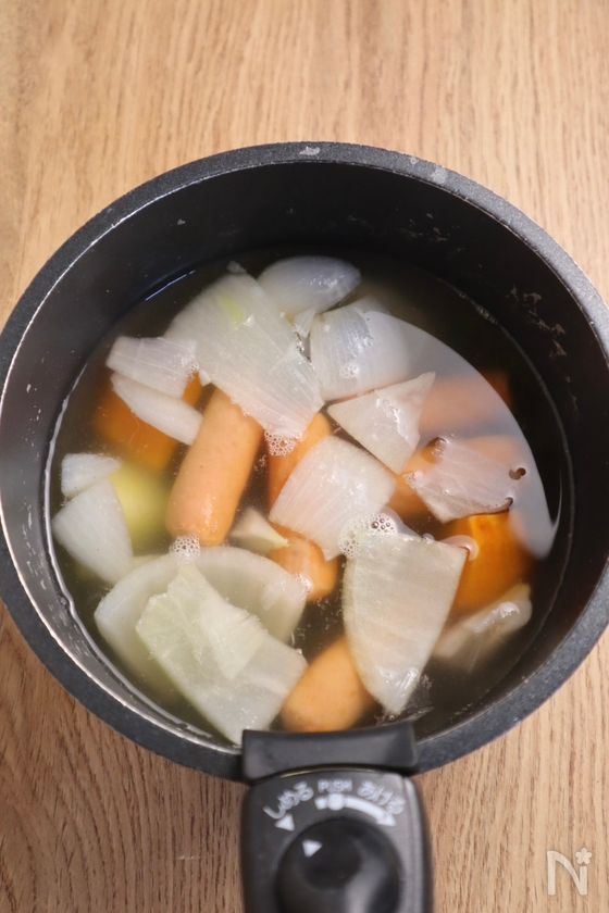 (1) 鍋に水を入れて沸騰させたら、【A】、カレー用野菜ミックス(凍ったまま)、ウインナーを加え、弱火で15〜20分程度煮込む。
