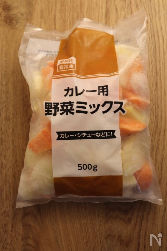 (3) 業務スーパーのカレー用野菜ミックスを使用しました。名前のとおりカレー用として使うのはもちろん、シチュー、ポトフ、炒め物、スープなどさまざまな料理にアレンジできます。玉ねぎ・じゃがいも・にんじんの3種類があらかじめ食べやすい大きさにカットされており、皮むきや包丁いらずで使える便利な冷凍野菜ミックスです。軽く湯通ししてから急速冷凍されているため、調理の際に凍ったまま使えるのもポイント。忙しい日やサッと作りたい日の時短アイテムとして重宝します。