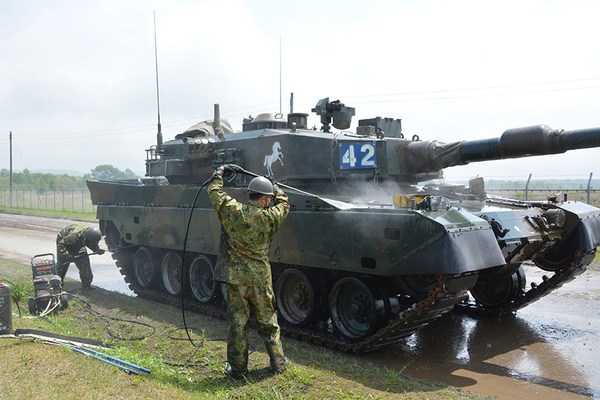 90式戦車を洗車する自衛隊員(画像:陸上自衛隊)。