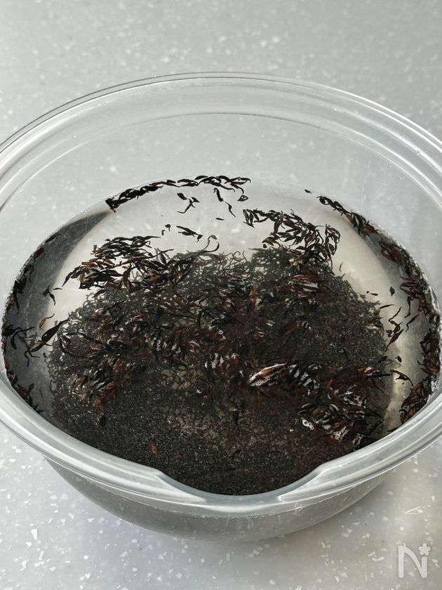 (1) 戻したひじきはざるに上げて流水で洗い流してから、熱湯でさっと茹でてざるに上げる。