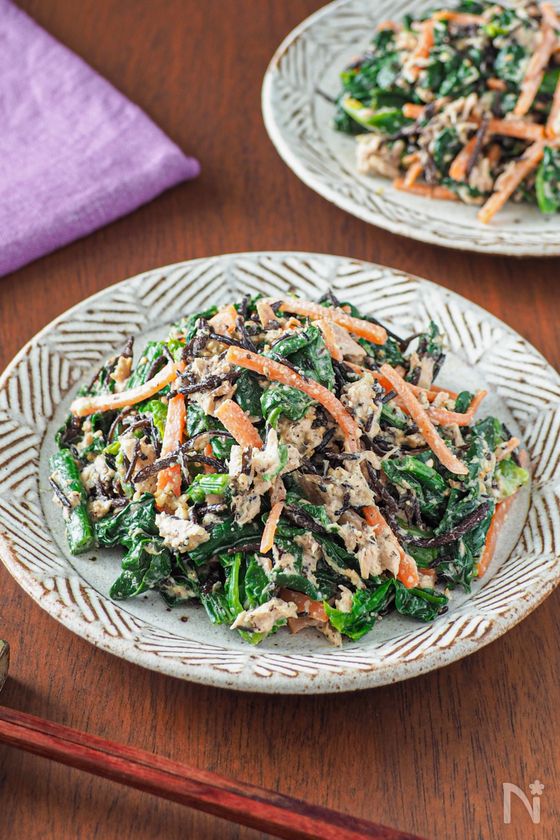 (4) ボウルに【A】を入れて混ぜ合わせ、ほうれん草、にんじん、ひじき、汁けを軽く切ったツナ缶を加えて和える。
