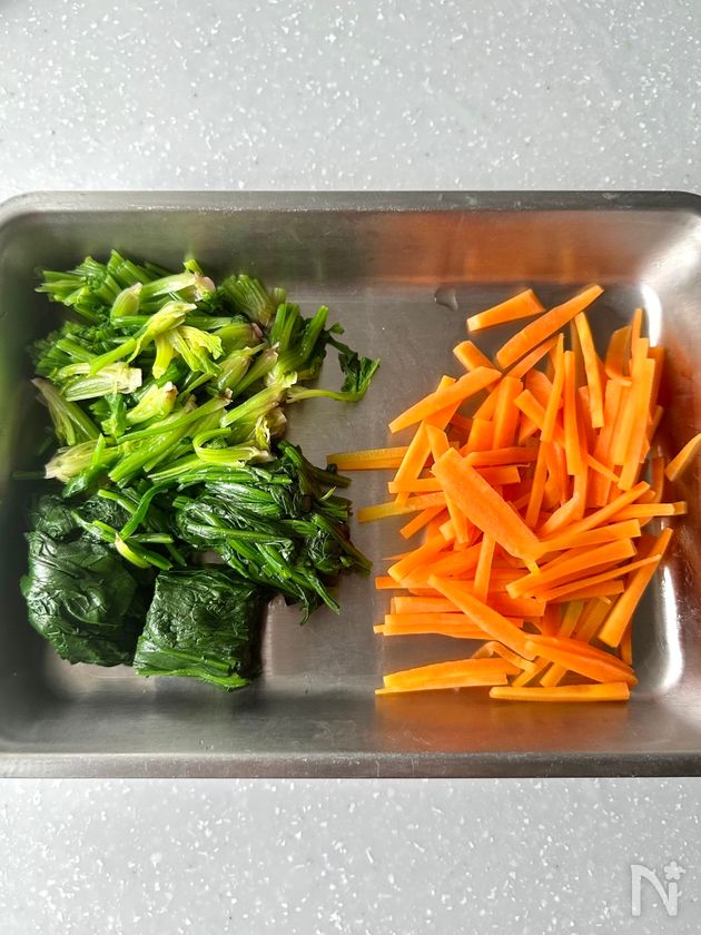 ほうれん草は根元から入れて30秒、葉をつけて30秒茹でて冷水に取り、ぎゅっとしぼって4cm長さに切る。