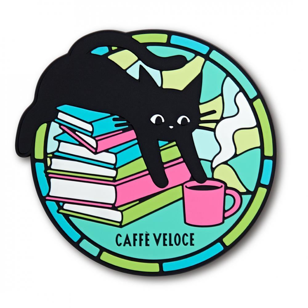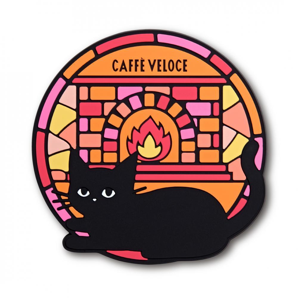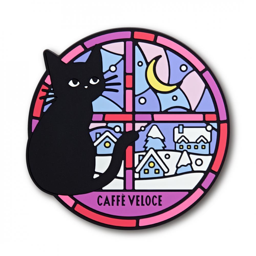 ステンドグラスから着想を得た、黒ねこラバーコースター。細部まで色使いにこだわった鮮やかなデザインで、幻想的な雰囲気を演出しています。