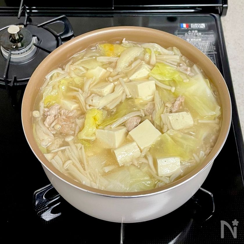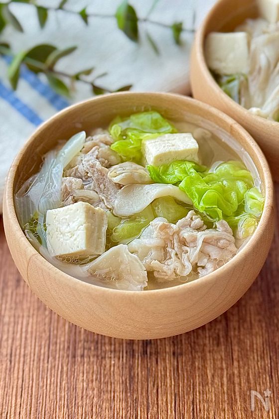 ・にんにくと生姜を加えて豚肉を炒めることで、香りよくコクのあるスープに。塩麹の旨みも加わり、やさしい味わいに仕上がります。