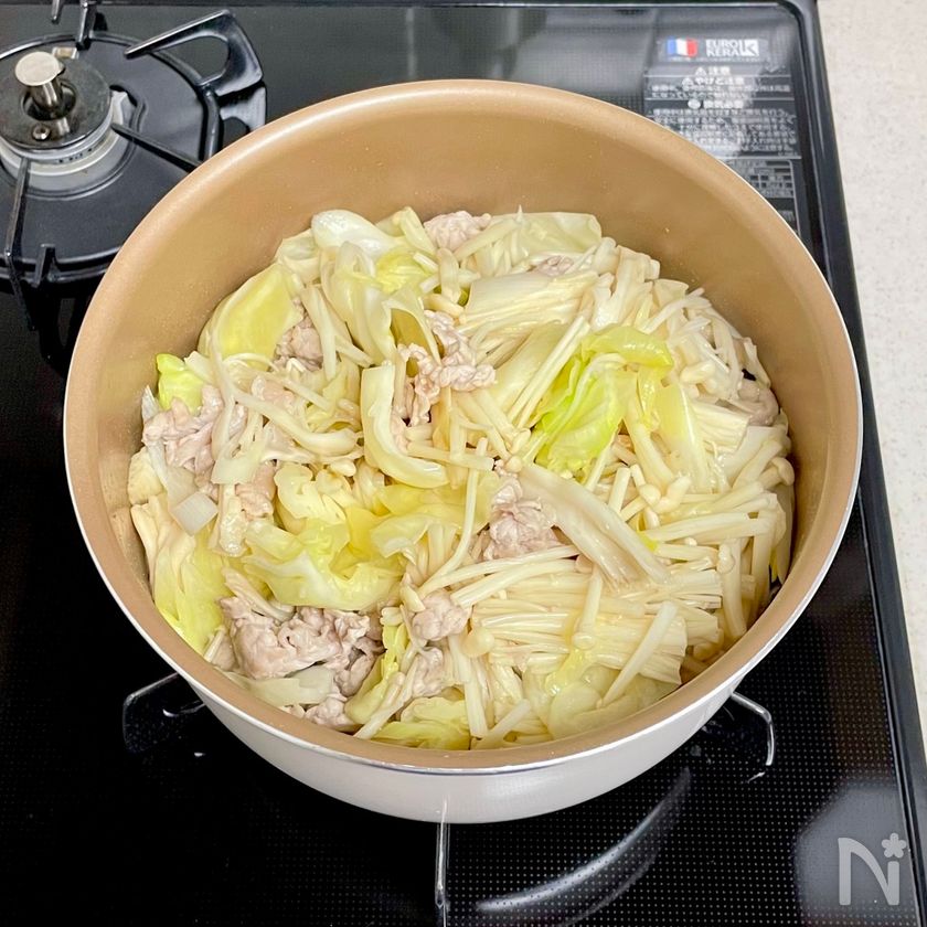 (3) 豚肉の色が変わったら、キャベツ・長ネギ・舞茸・えのき茸を加えて炒める。
