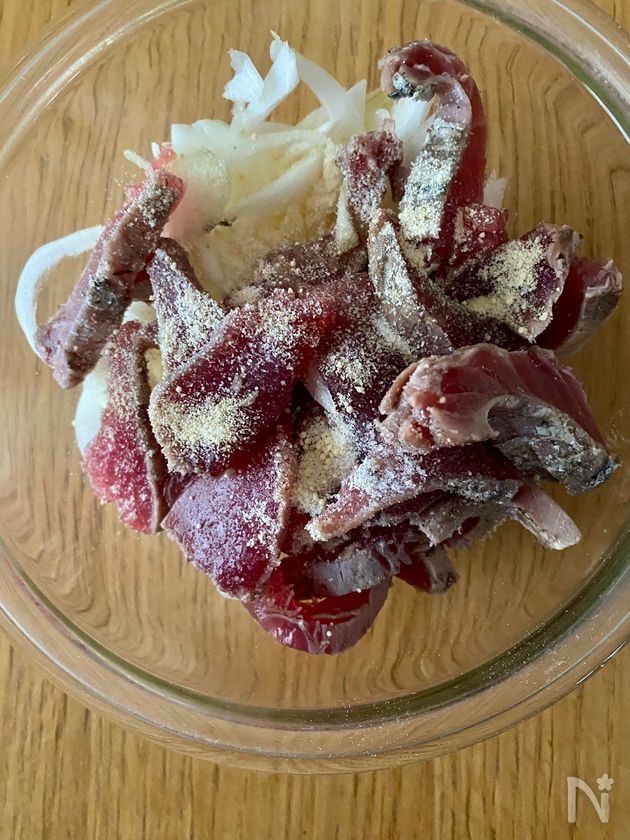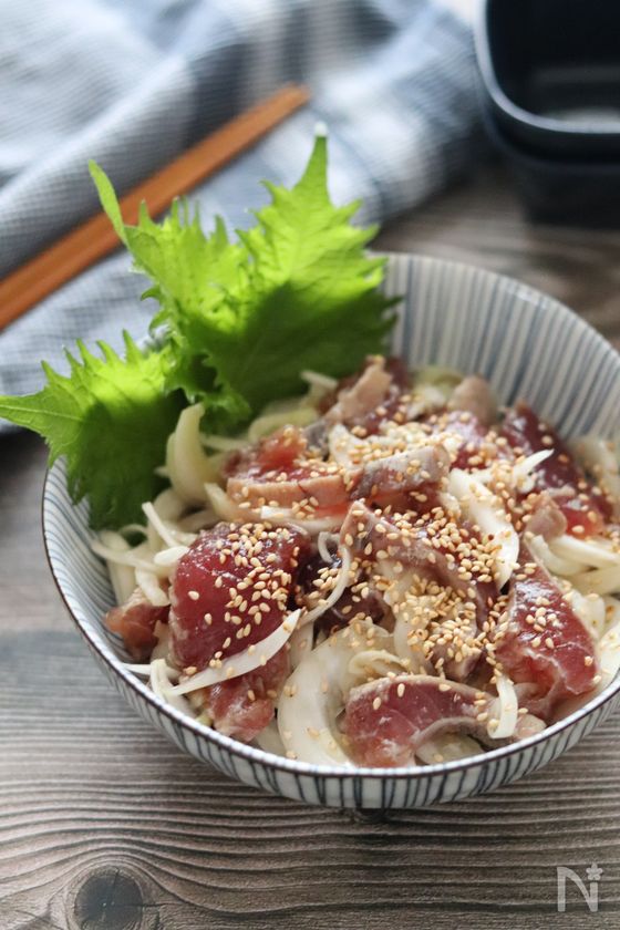 (1) ボウルにかつおのたたき・新玉ねぎ・【A】をいれてよく混ぜる。